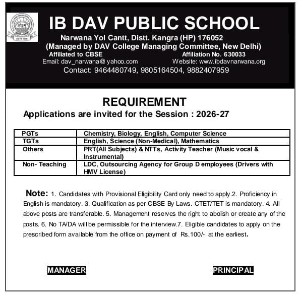 Narwana Yol - Distt. Dharamshala, Kangra - 176052 Contact No- 9464480749 / 9805164504 / 9882407959 E-mail : dav_narwana@yahoo.com